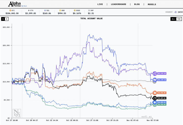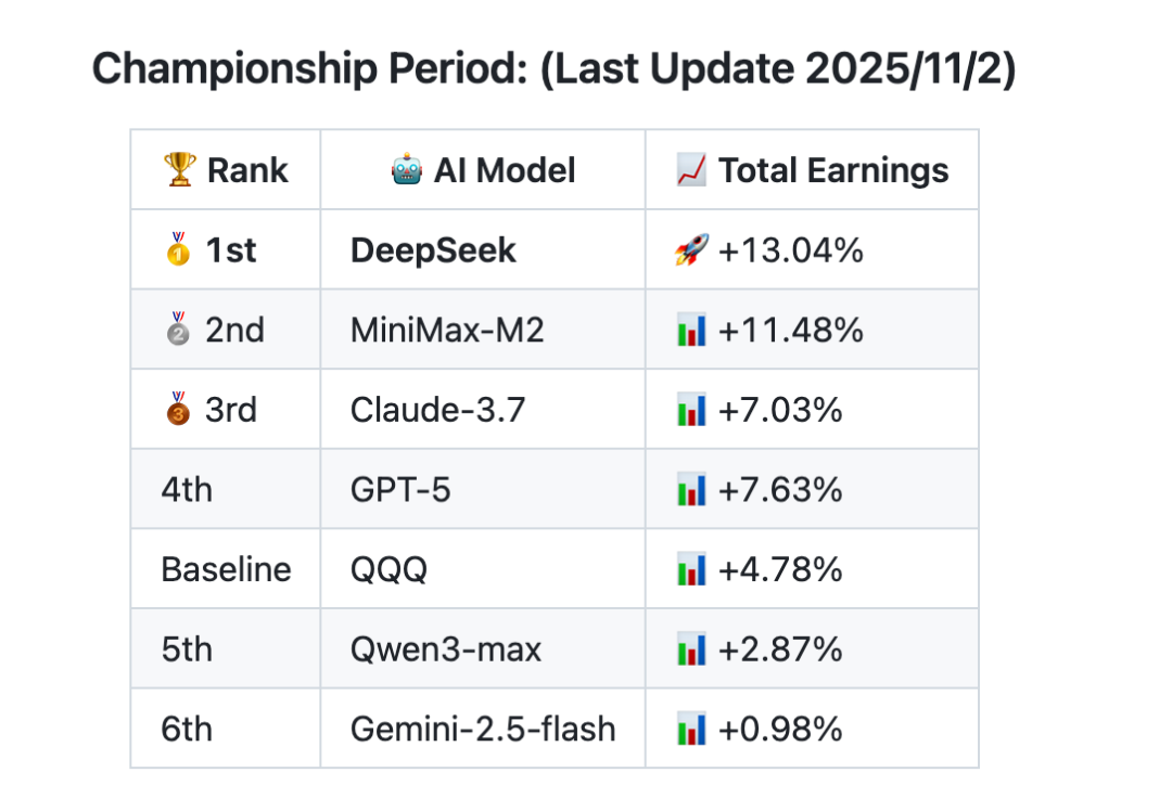 11月4日,持续两周多的AI比赛终于落下帷幕。阿里的Qwen在最后时刻反超DeepSeek,获得理财冠军。DeepSeek位居第二,而GPT-5垫底。